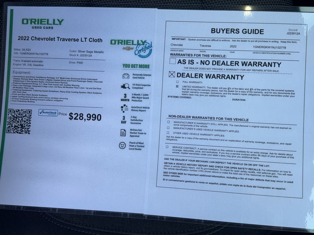 This 2022 Chevrolet Traverse has a clean AutoCheck report, ensuring its impeccable vehicle history. Protect this model from unwanted accidents with a cutting edge backup camera system. This vehicle's AutoCheck: 1 owner, assurance of single-owner history for peace of mind. This vehicle features a hands-free Bluetooth phone system. This 2022 Chevrolet Traverse keeps you comfortable with Auto Climate. Never get into a cold vehicle again with the remote start feature on the Chevrolet Traverse. This 1/2 ton suv stays safely in its lane with Lane Keep Assist. It offers Android Auto for seamless smartphone integration. Apple CarPlay: Seamless smartphone integration for the Chevrolet Traverse - stay connected and entertained on the go! Front wheel drive on this Chevrolet Traverse gives you better traction and better fuel economy. Keep safely connected while in the Chevrolet Traverse with OnStar. You may enjoy services like Automatic Crash Response, Navigation, Roadside Assistance and Hands-Free Calling.