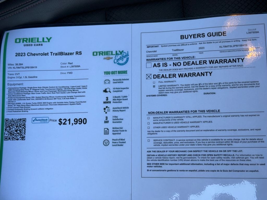 Keep your hands warm all winter with a heated steering wheel in this unit . This model offers Automatic Climate Control for personalized comfort. Bluetooth technology is built into this vehicle, keeping your hands on the steering wheel and your focus on the road. See what's behind you with the back up camera on the Chevrolet TrailBlazer. Never get into a cold vehicle again with the remote start feature on this Chevrolet TrailBlazer. This mid-size suv has a clean AutoCheck report, ensuring its impeccable vehicle history. This Chevrolet TrailBlazer's Lane Departure Warning helps keep you in your lane. Lane Keep Assist in the Chevrolet TrailBlazer helps maintain safe driving by gently steering to stay within the lane. The leather seats in this unit are a must for buyers looking for comfort, durability, and style. The vehicle's AutoCheck: 1 owner, assurance of single-owner history for peace of mind. This mid-size suv has a 3 Cyl, 1.3L high output engine.