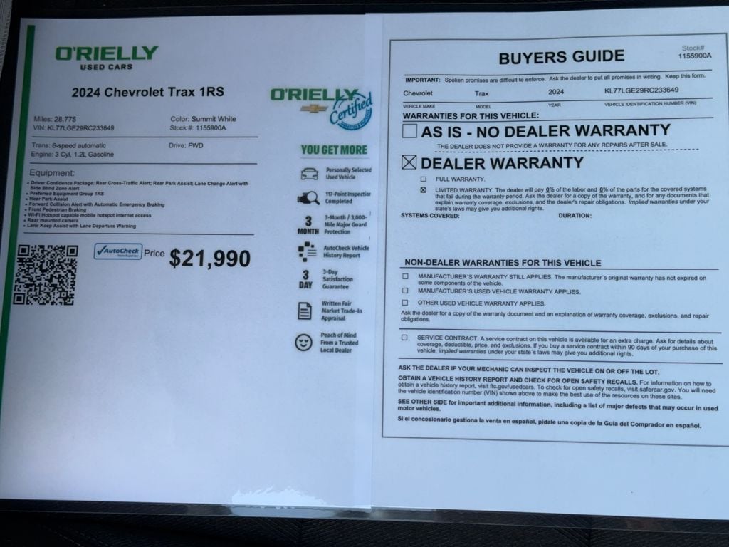This 2024 Chevrolet Trax warns of approaching vehicles with Cross-Traffic Alert. Keep your hands warm all winter with a heated steering wheel in the Chevrolet Trax . The Chevrolet Trax stays safely in its lane with Lane Keep Assist. This small suv has a clean AutoCheck report. The Chevrolet Trax's AutoCheck: 1 owner, assurance of single-owner history for peace of mind. The vehicle's Lane Departure Warning keeps you safe by alerting you when you drift from your lane. Protect the Chevrolet Trax from unwanted accidents with a cutting edge backup camera system. Bluetooth technology is built into the Chevrolet Trax, keeping your hands on the steering wheel and your focus on the road. Front wheel drive on the vehicle gives you better traction and better fuel economy. This Chevrolet Trax shines with clean polished lines coated with an elegant white finish. Keep safely connected while in this model with OnStar. You may enjoy services like Automatic Crash Response, Navigation, Roadside Assistance and Hands-Free Calling.