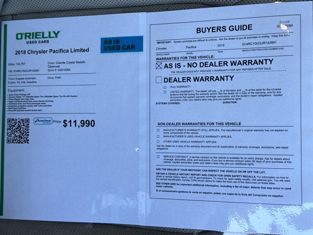 with XM/Sirus Satellite Radio you are no longer restricted by poor quality local radio stations while driving this model. Anywhere on the planet, you will have hundreds of digital stations to choose from. The installed navigation system will keep you on the right path. This Chrysler Pacifica comes equipped with Android Auto for seamless smartphone integration on the road. Start the vehicle from inside with remote start. The leather seats in this unit are a must for buyers looking for comfort, durability, and style. Bluetooth technology is built into this vehicle, keeping your hands on the steering wheel and your focus on the road. See what's behind you with the back up camera on the vehicle. This 2018 Chrysler Pacifica is pure luxury with a heated steering wheel. It offers Apple CarPlay for seamless connectivity. This Chrysler Pacifica has a clean AutoCheck report, ensuring its impeccable vehicle history. Load groceries and much more with ease into the vehicle thanks to the power liftgate.