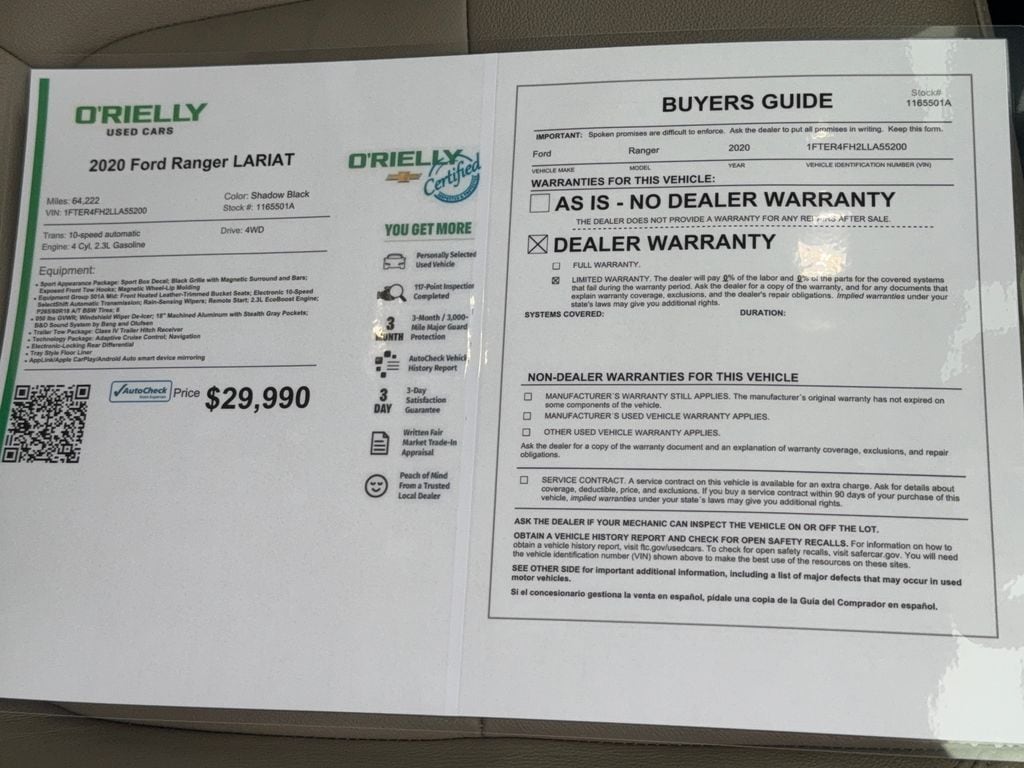 This small pickup has automated speed control that adjusts to maintain a safe following distance, enhancing highway driving convenience. Apple CarPlay: Seamless smartphone integration for this unit - stay connected and entertained on the go! This small pickup is equipped with the latest generation of XM/Sirius Radio. This vehicle features a hands-free Bluetooth phone system. The leather seats in this model are a must for buyers looking for comfort, durability, and style. The installed navigation system will keep you on the right path. The rear parking assist technology on this Ford Ranger will put you at ease when reversing. The system alerts you as you get closer to an obstruction. Start the Ford Ranger from inside with remote start. This vehicle has a clean AutoCheck report. This Ford Ranger offers Android Auto for seamless smartphone integration. See what's behind you with the back up camera on this Ford Ranger. This Ford Ranger offers Automatic Climate Control for personalized comfort.