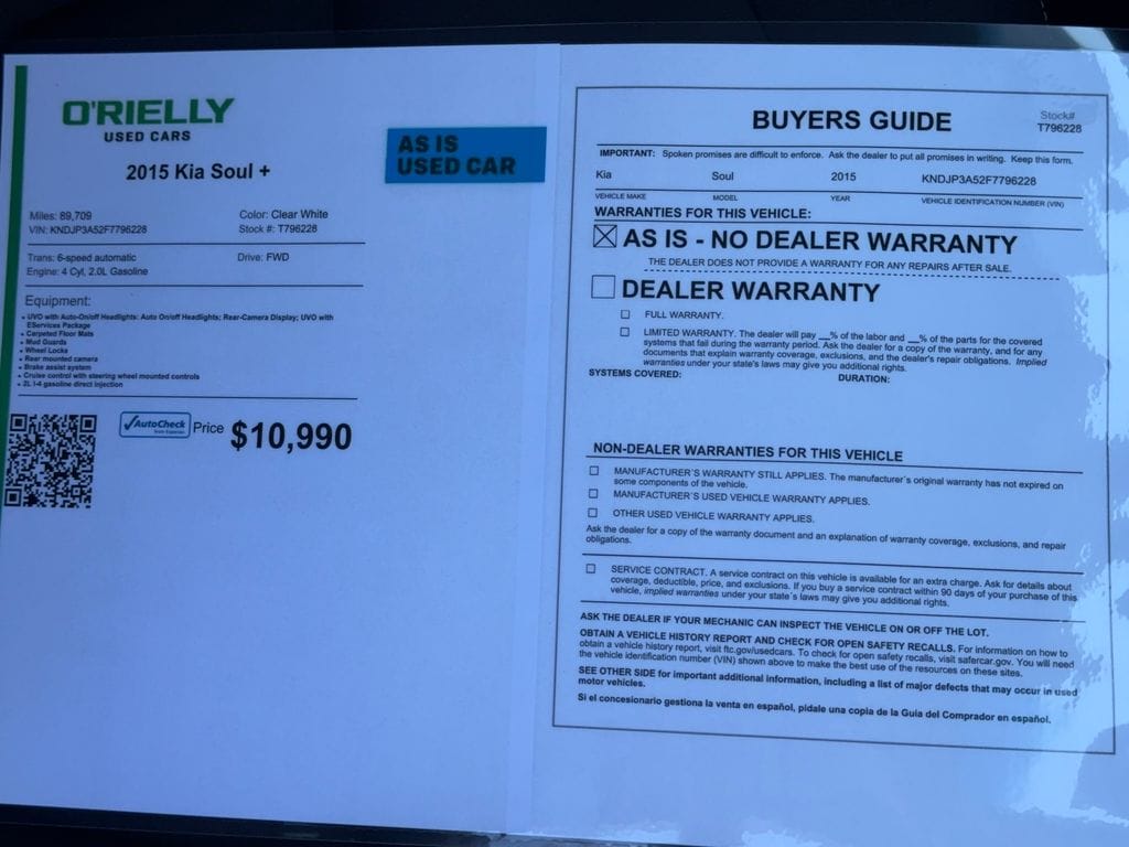 The vehicle features a hands-free Bluetooth phone system. See what's behind you with the back up camera on the Kia Soul. The Kia Soul has a clean AutoCheck report. Maintaining a stable interior temperature in this model is easy with the climate control system. This 2015 Kia Soul has a 4 Cyl, 2.0L high output engine. This small suv embodies class and sophistication with its refined white exterior. It is front wheel drive. The Electronic Stability Control will keep you on your intended path. This small suv has an automatic transmission. Enjoy the tried and true gasoline engine in this unit. Anti-lock brakes will help you stop in an emergency. This small suv features cruise control for long trips. This small SUV will zip through traffic.