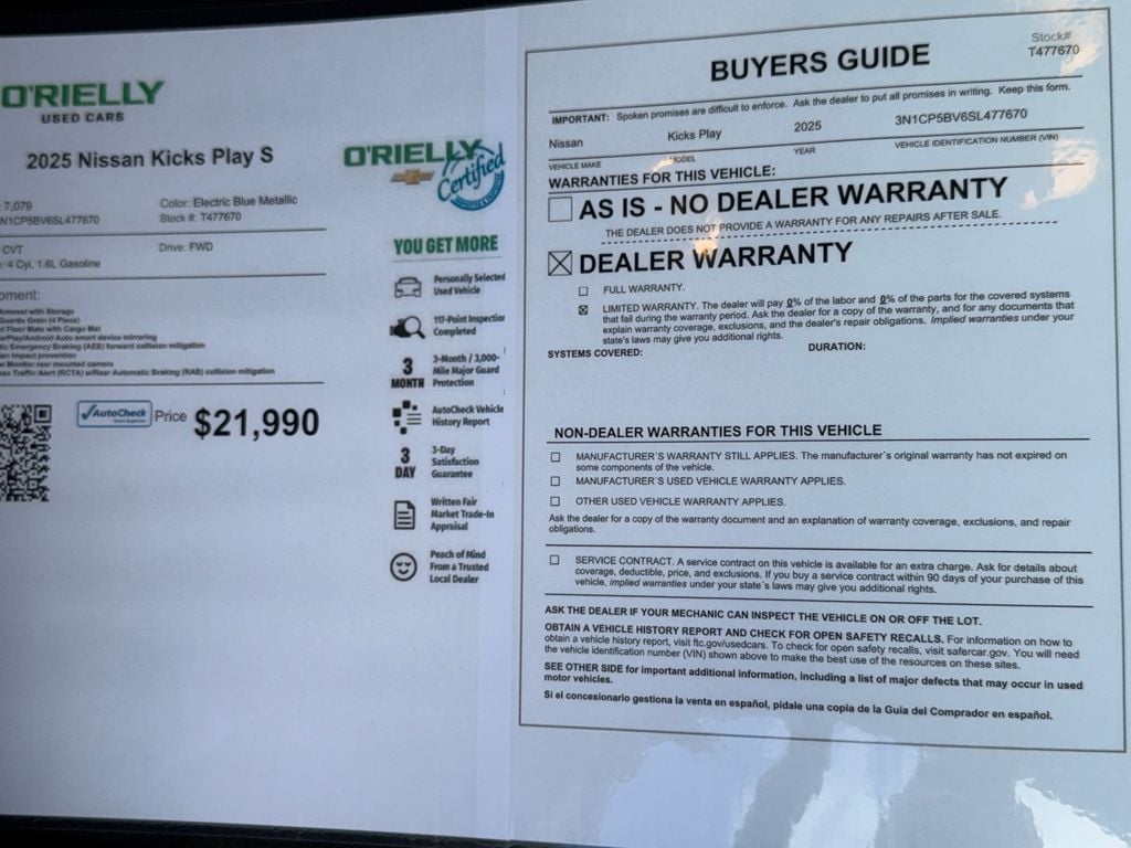 Apple CarPlay: Seamless smartphone integration for this unit - stay connected and entertained on the go! This small suv has a clean AutoCheck report. This Nissan Kicks Play features a hands-free Bluetooth phone system. The rear parking assist technology on it will put you at ease when reversing. The system alerts you as you get closer to an obstruction. This Nissan Kicks Play's AutoCheck: 1 owner, assurance of single-owner history for peace of mind. See what's behind you with the back up camera on the Nissan Kicks Play. The vehicle comes equipped with Android Auto for seamless smartphone integration on the road. This unit's Lane Departure Warning keeps you safe by alerting you when you drift from your lane. Impresses the most discerning driver with the deep polished blue exterior on this unit. Maintaining a stable interior temperature in this unit is easy with the climate control system. This vehicle has a 4 Cyl, 1.6L high output engine.